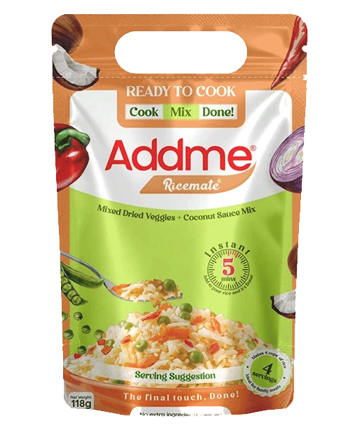 Bursting with the creamy richness of coconut and a colorful medley of veggies, RiceMate is the secret to making your everyday rice feel like a special occasion. Whether you’re making coconut rice, elevating jollof rice, or just want to jazz up plain white rice, Addme RiceMate brings everything you need—flavor, aroma, ease, and nutrition—No stress. No chopping. Just delicious, family-friendly goodness every time.
